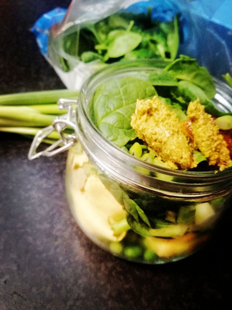 Generally, I find sandwiches pretty boring, and I always try to find different lunch ideas, and love this. It takes 5 minutes to assemble the ingredients at home and when you’re ready to eat just top up your container with freshly boiled water. Just make sure you use a jar or container that can handle boiling water. Mason jars are ideal, but I’ve also repurposed the plastic containers that you buy ready made soups or stews in.