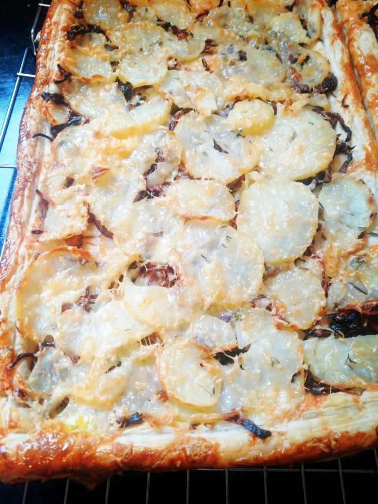 Sprinkle the caramelised onions on the pastry (keeping the edges clear), then lay out the slices of potato on top and sprinkle with herbs and grated cheese