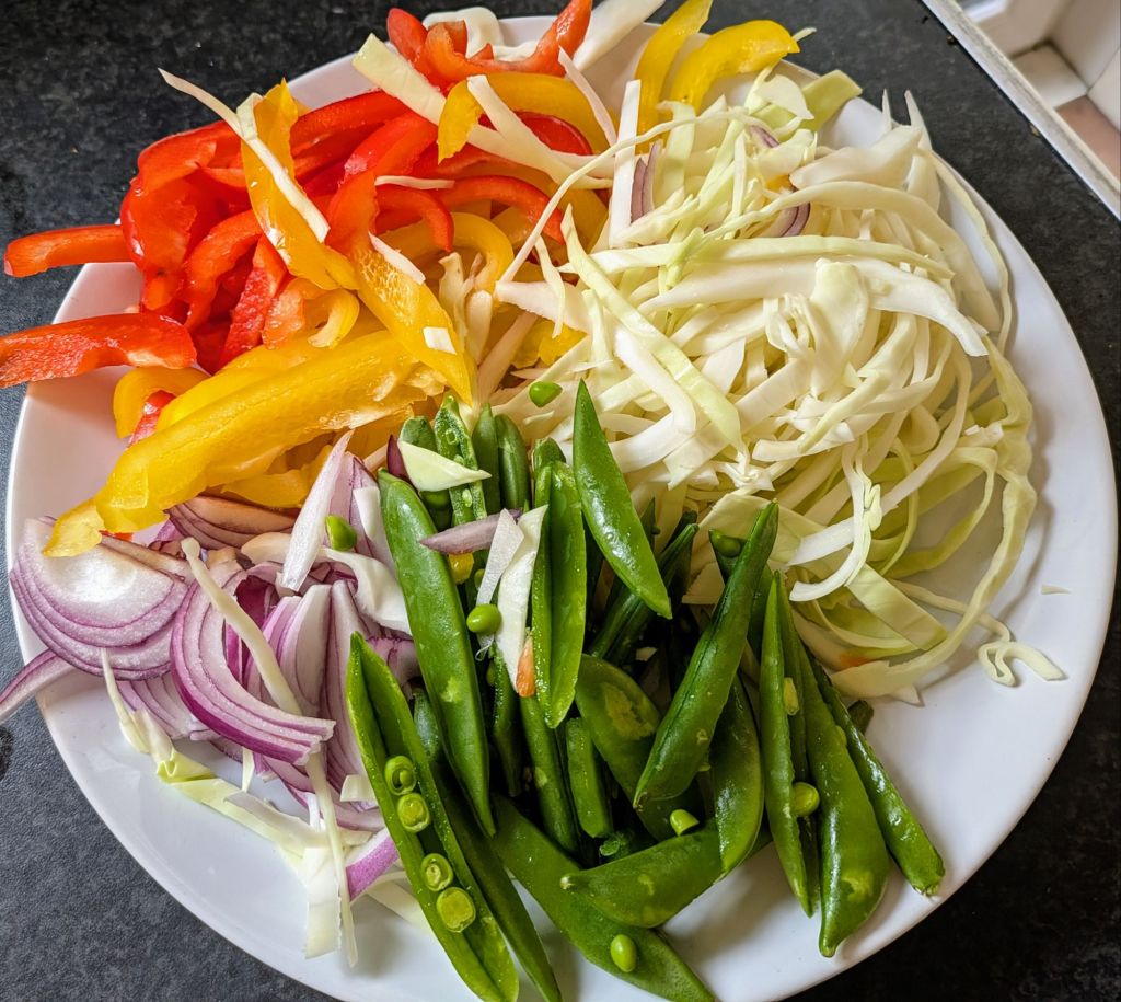 For the pickled vegetables, add the chopped vegetables to a large jar. Combine the water, vinegar and sugar and pour over the vegetables. Seal the jar and shake before letting stand for 30 minutes