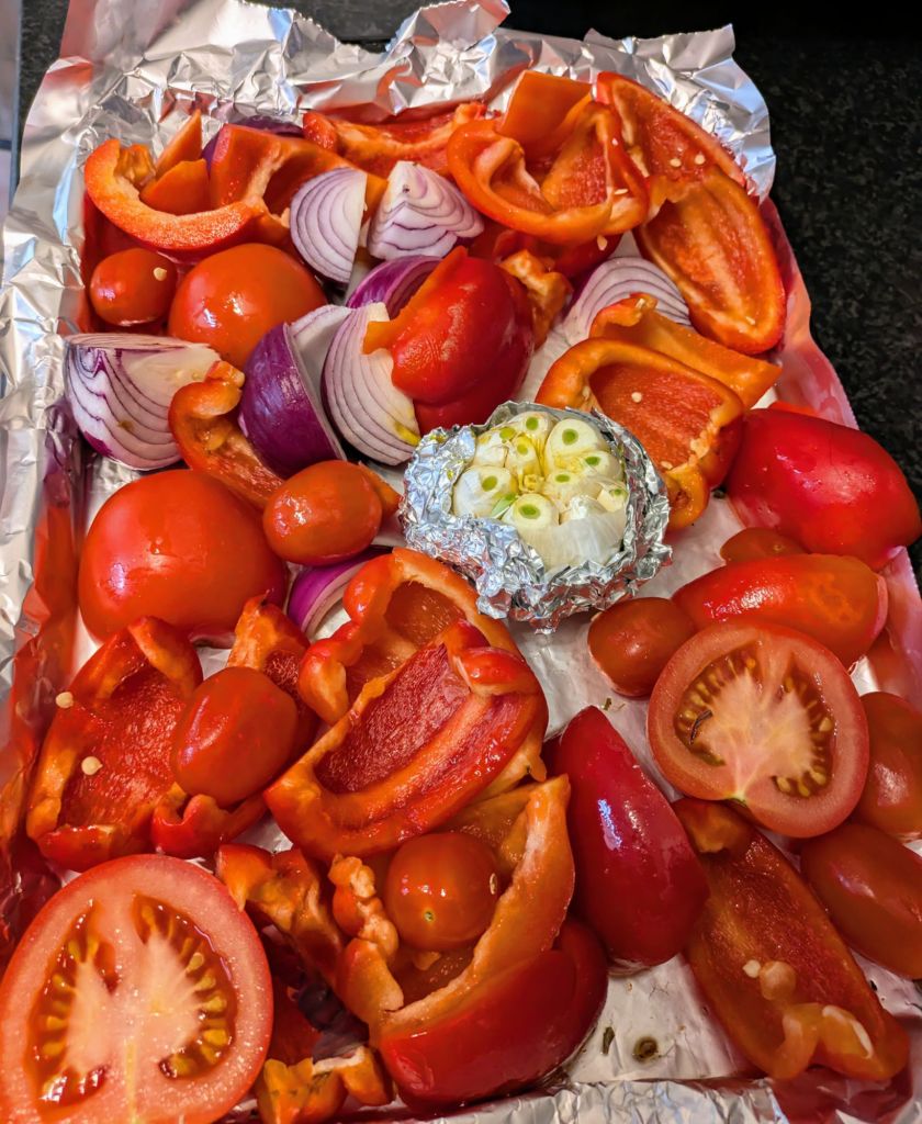 Add the onion, pepper, tomatoes and garlic to oven proof dish, drizzle with oil and roast at 180 degrees (Celsius) for around 30 minutes or until the edges of the pepper start to char. Remove from the oven and allow to cool slightly