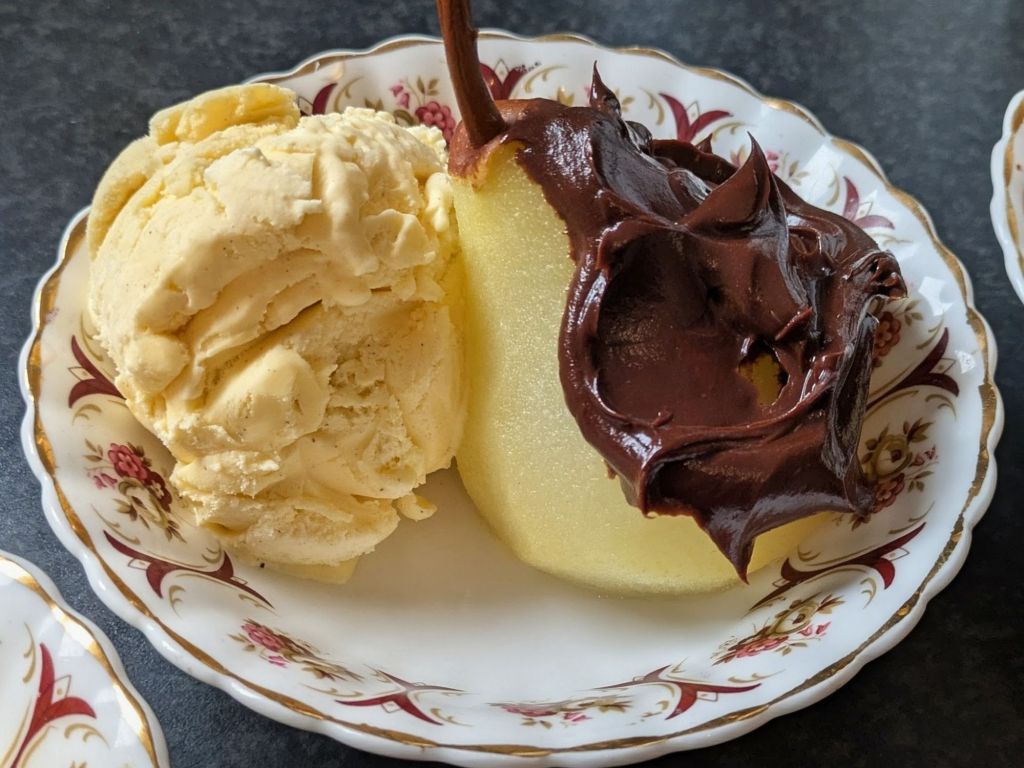 This classic french recipe is perfect if you have really hard pears and can’t be bothered waiting on them softening. I mean, soft poached pears, vanilla ice cream and hot chocolate sauce, OMG Yum.