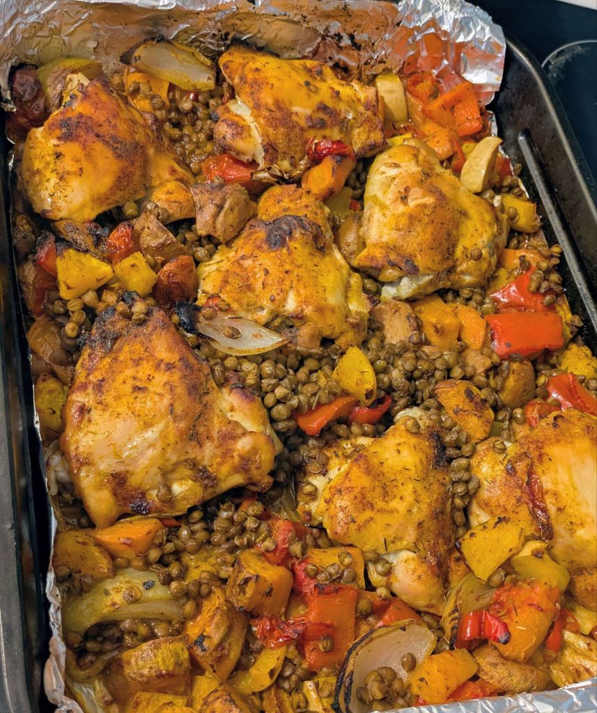 With the days getting colder and shorter this is proper comfort food but still pretty healthy with all your brightly coloured vegetables and plenty of protein from the chicken and lentils. What makes it even better is that it’s a one pan dish meal.