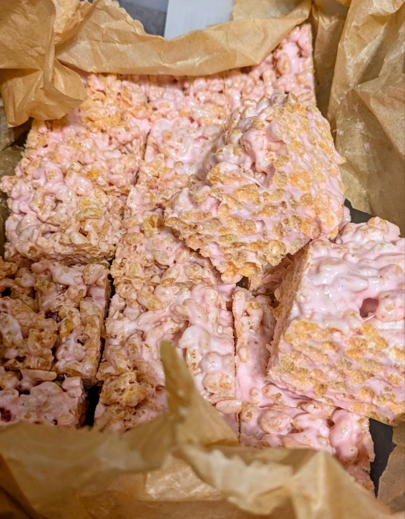 Transfer to the lined dish and spread out evenly with the back of a spoon or spatula. Allow to set in the fridge for at least an hour. If your feeling especially bougie, you could top the rice krispie treats with 150 grams of melted chocolate (it makes the top of the squares nice and smooth, but honestly I prefer them as they are)