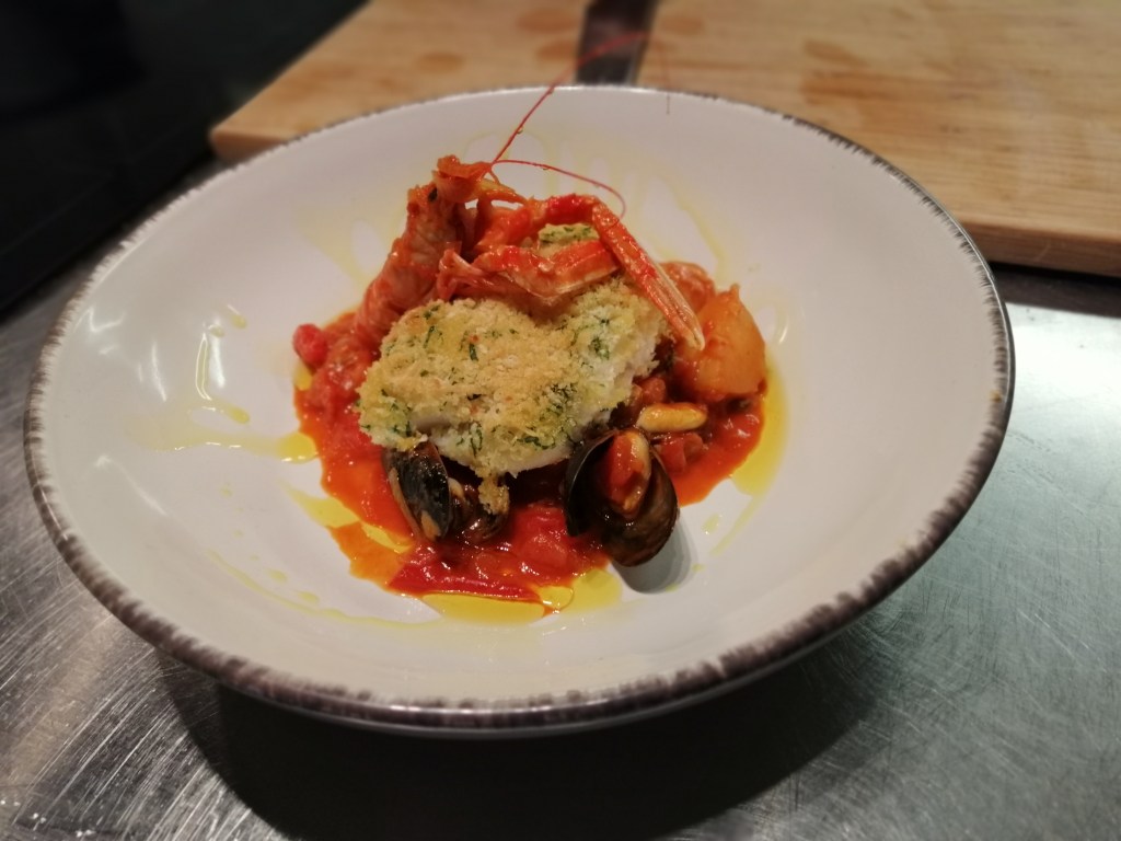 Cod cooked with herb crumb, served with a shellfish ragu.