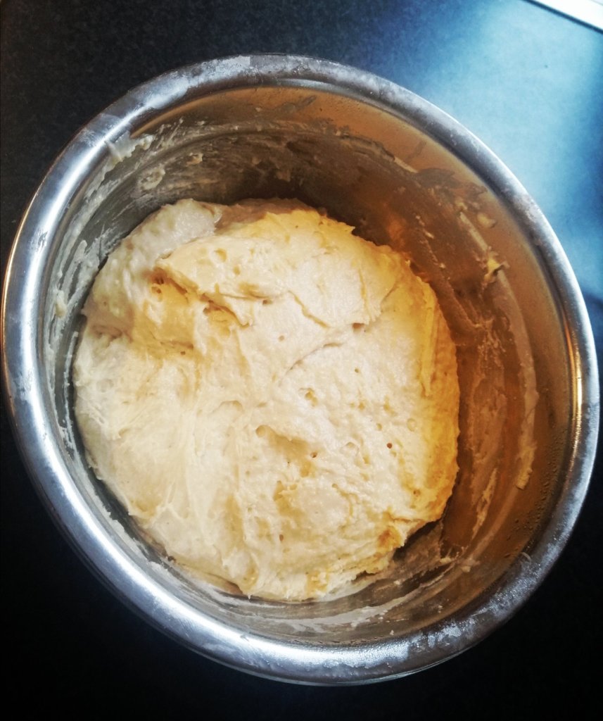 Stir in half the flour, and then add the melted butter and remaining flour and mix well. The douch will be pretty sticky so transfer to a greased bowl and cover with cling film and keep in a fridge over night or at least 3 hours