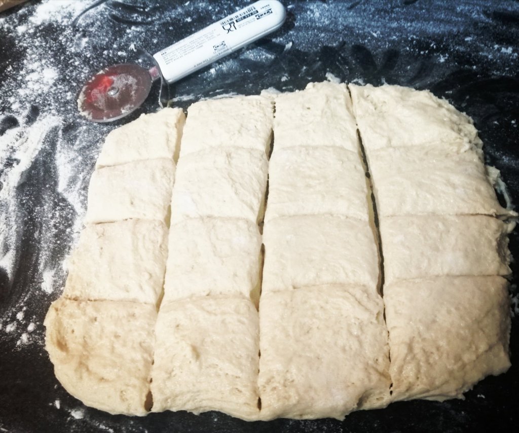 Roll the dough in to an oblong and trim the edges. I use a pizza cutter to cut the dough into 18 oblongs (you can use a knife, but I found this worked well