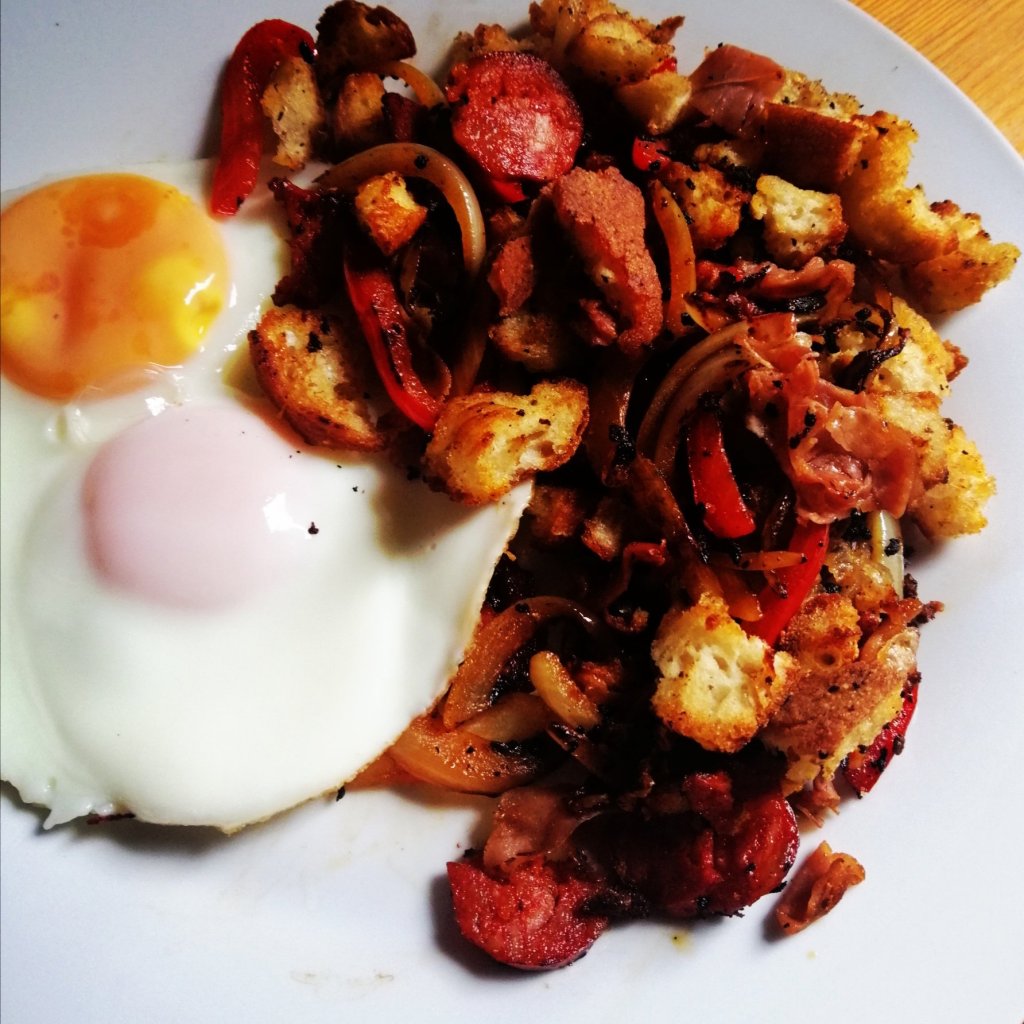 This dish apparently started with poor shepherds in Spain and Portugal. I like recipes that allow you to use up what’s available and this is perfect for using up scraps of streaky bacon, ham or other smokey meats or cold cuts