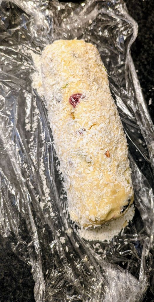 • Shape the cookie dough into a sausage shape, about 3-4 cm in diameter and set on top of the coconut and gently press the coconut into the sides of the cookie dough sausage until it is thoroughly coated