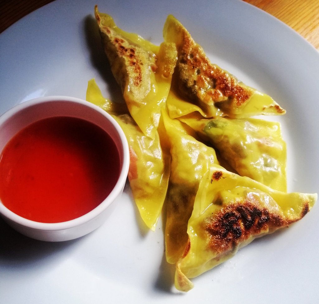Place your dumplings in the pan (don’t try to squeeze too many in the pan at once). Cook for 2 minutes or until the bottoms have started to brown, then add a couple of tablespoons of boiling water (the pan shouldn’t be swimming in water), and cover with a lid and cook for a further 1-2 minutes until the water has been absorbed