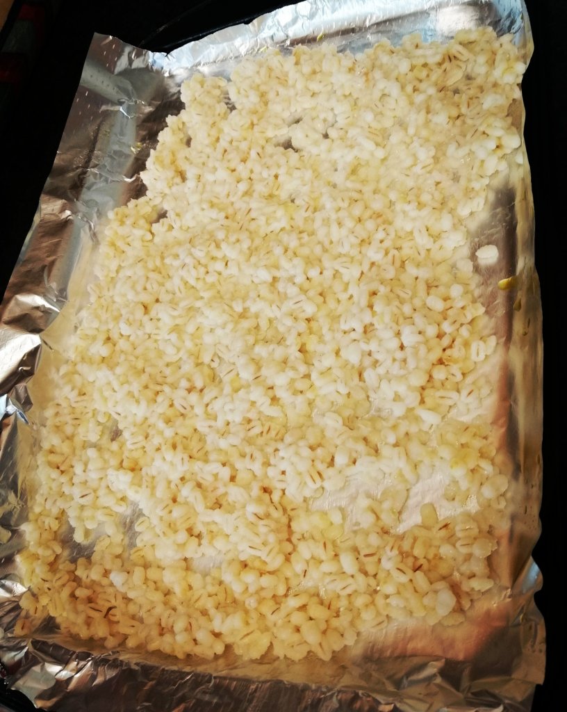- Cook the barley according to the instructions on the packet. Lightly oil a shallow baking tray and spread the cooked barley across it to cool