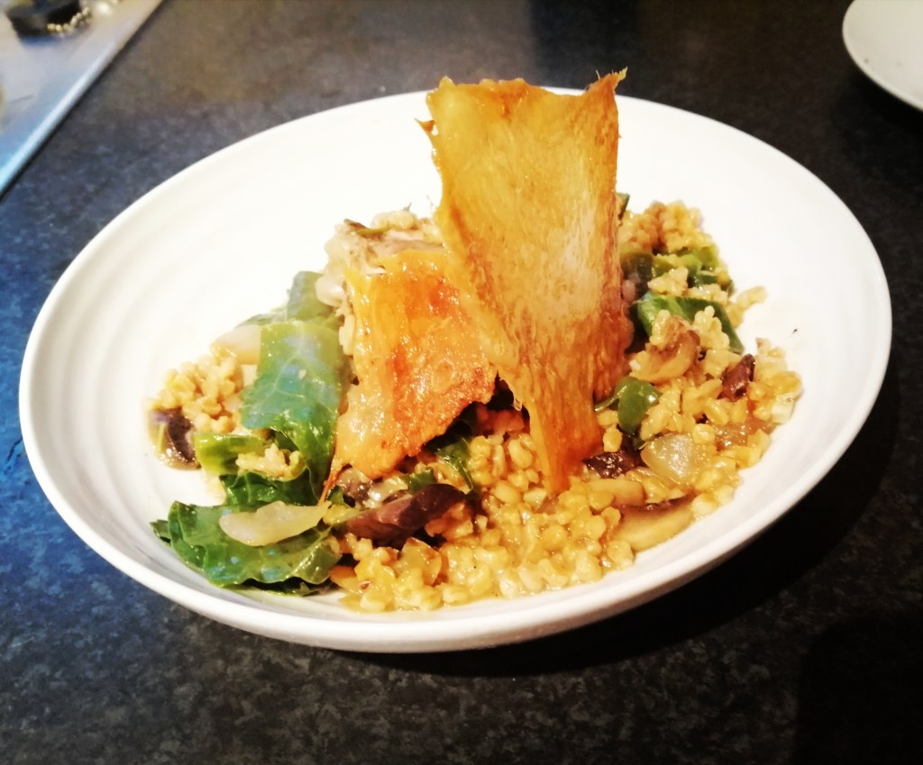 Chicken with Pearl Barley and Mushrooms, with Chicken Crackling (naughty but nice)