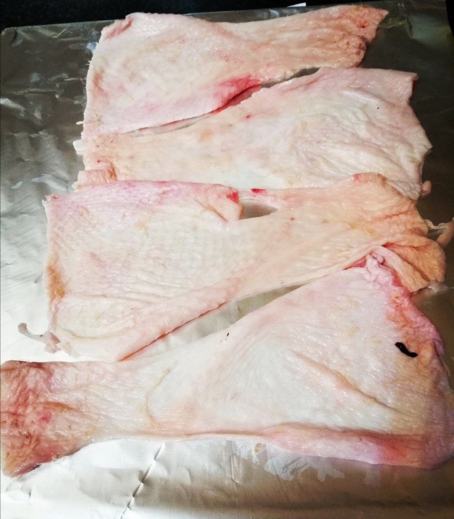 7. Trim the chicken skin and flatten on a baking sheet before sprinkle with salt. Place another baking tin on top of the chicken skin to keep it flat and bake in an oven pre-heated to 200 degrees for 20-30minutes, or until golden brown