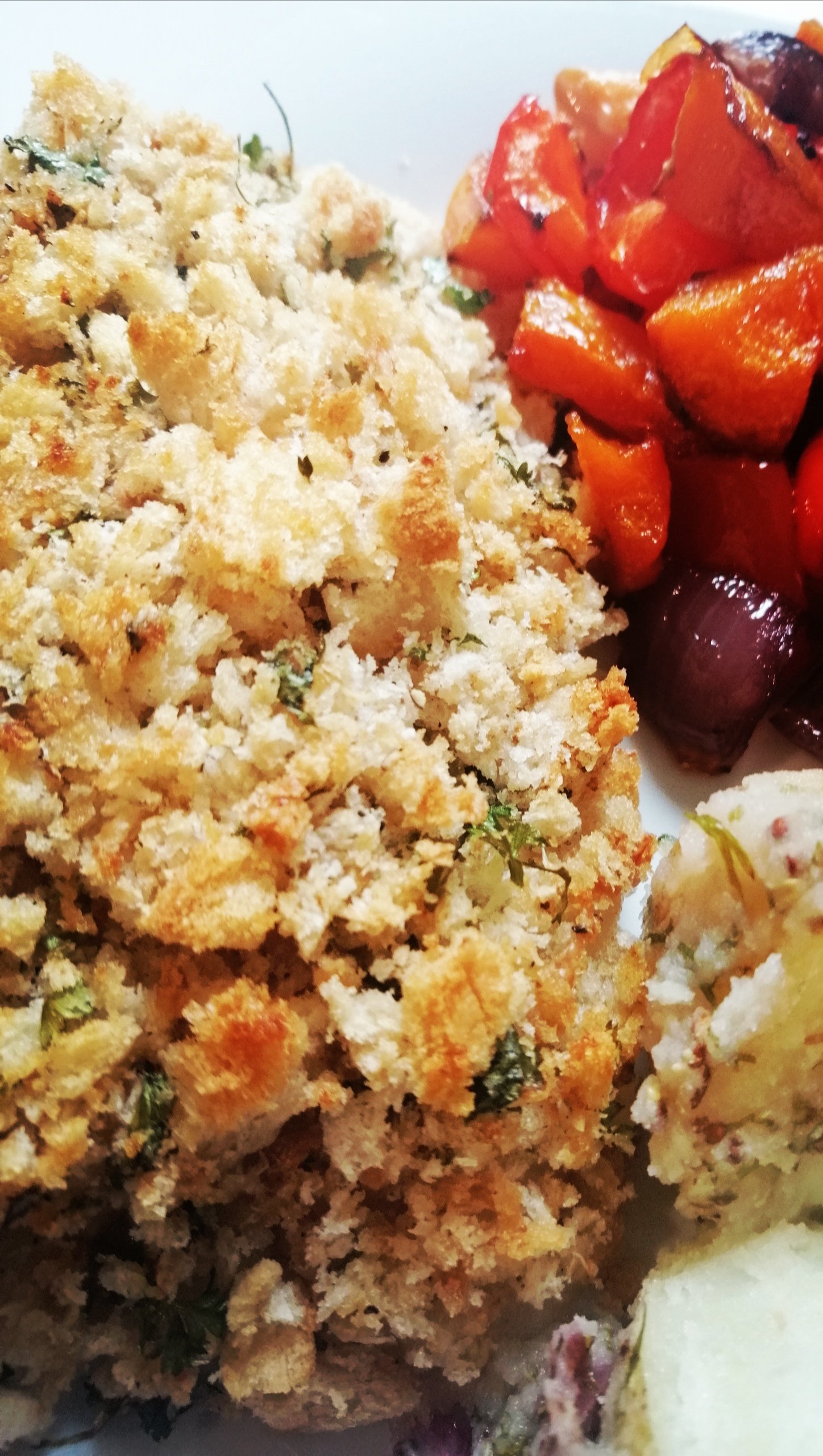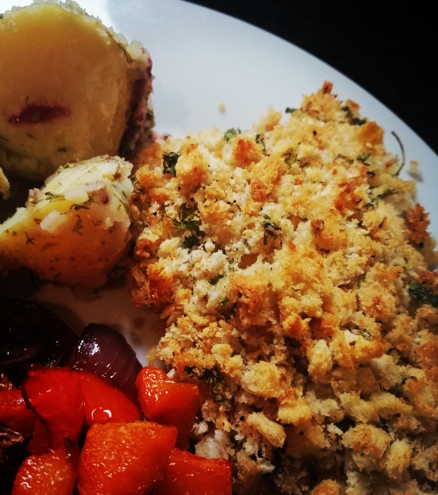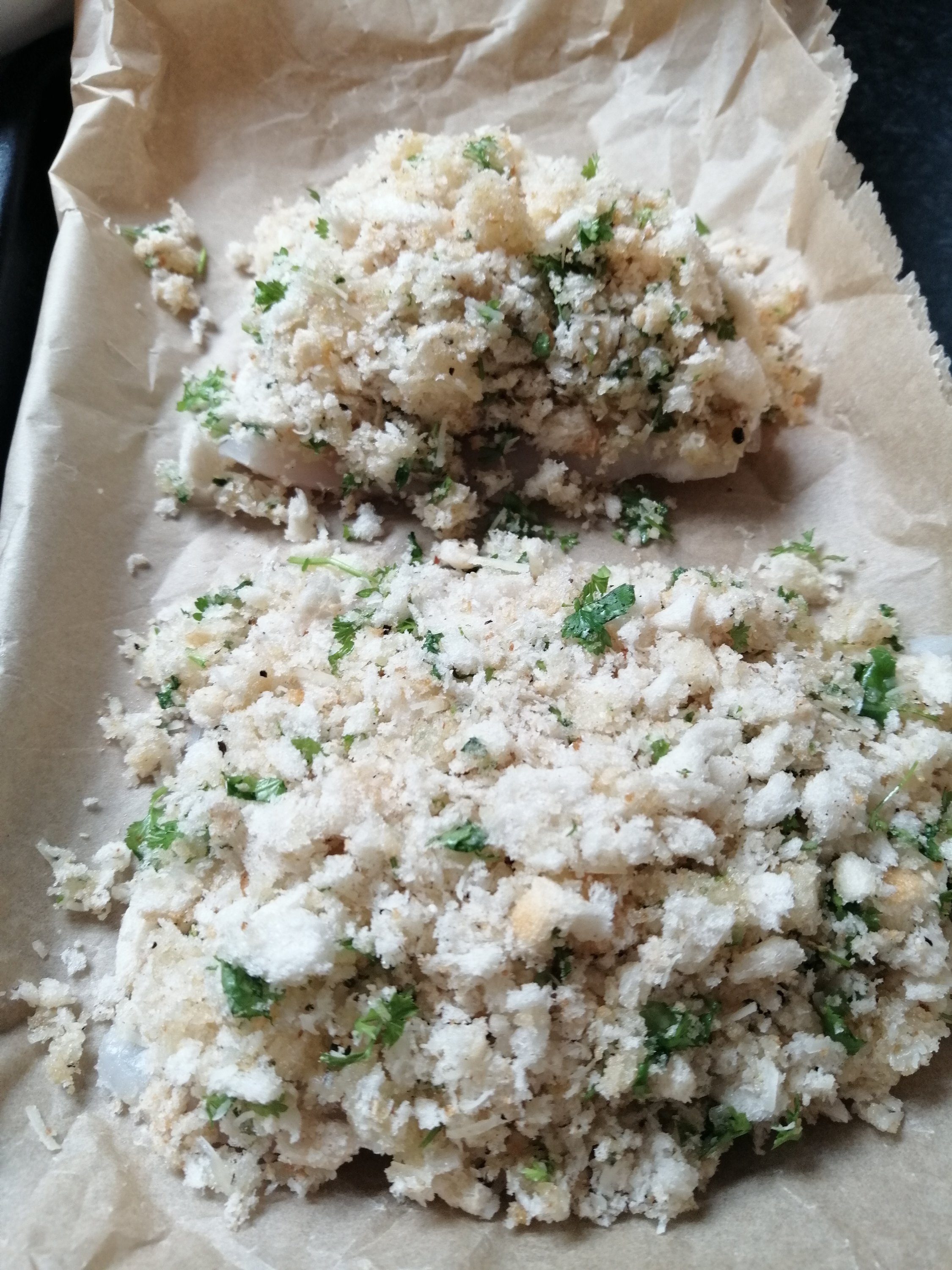 Place your fish on baking parchment in a baking try and pat the breadcrumbs on top. Bake for 10-15 minutes until the breadcrumbs are brown and toasted. If you’re cooking a particularly thick piece of fish you make need to give it a little longer but be careful not to over cook